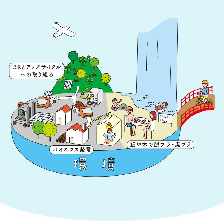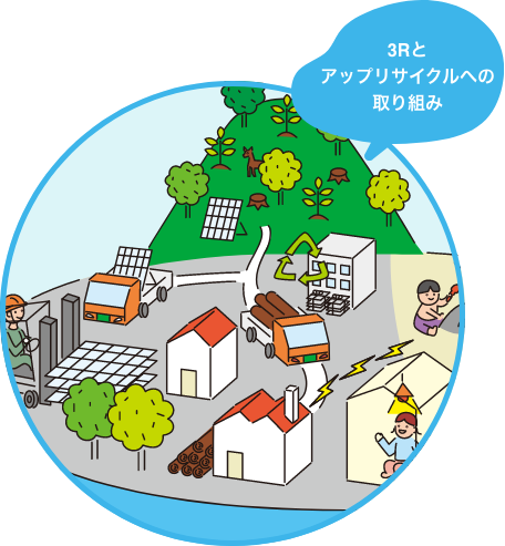 リデュース(廃棄物発生の抑制)、リユース(資源及び製品の再使用)、リサイクル(再生利用)、アップサイクル(創造的再利用)を通して、環境保護への取り組みが定着した社会へ。3Rでゴミや廃棄物の発生を可能な限り減らし、ゴミの焼却や埋め立て処理に伴う環境負担の軽減に貢献します。