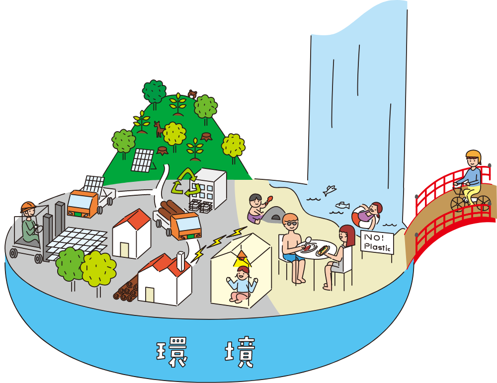 環境負荷低減への道標は、再生可能エネルギーの活用、化石資源から代替資源へ、リサイクル・リデュース・リユース・アップサイクル、自然素材の活用で脱プラ廃プラへ、環境配慮型製品サービスの開発。これらカーボンニュートラル実現に向けた取り組みで、持続可能な循環型社会が実現されます。