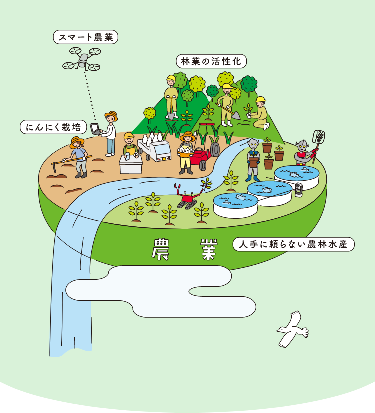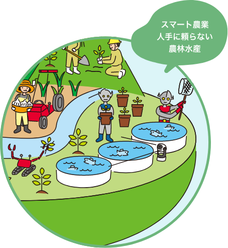 人手に頼らないスマート農業の推進で、作業の省力化や労力軽減、低コストで高品質な生産を図ります。このような取り組みが食料自給率の向上に繋がります。