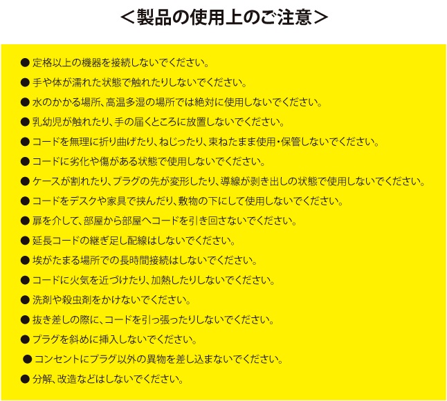 延長コードに異常を感じた場合は直ちに使用を中止し、取扱説明書をご確認の上、製品をお買い求めになられた販売店または弊社にお問い合わせください。