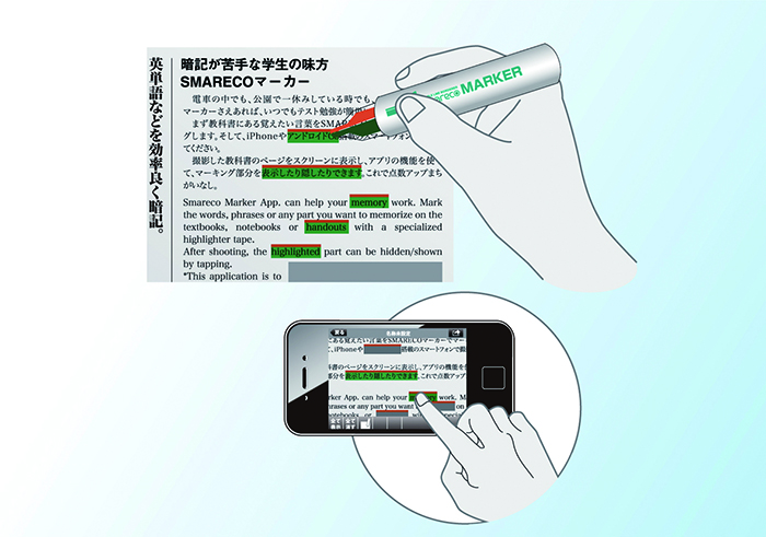 教科書や参考書などの暗記したい箇所をマーキングし専用アプリで撮影すると、マーキングした箇所を認識し、その部分の表示・非表示を選択できるデジタル暗記帳を作成できます。