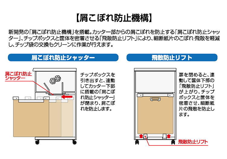 - 屑こぼれ防止シャッター・飛散防止リフトを搭載。カッター部やチップボックスからの 細断チップのこぼれや飛散を軽減します