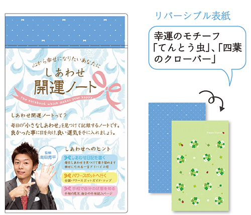 - 表紙は「ブルー/てんとう虫、四葉のクローバー」「ピンク/ハト」とそれぞれ幸運のモチーフをデザインしたリバーシブルタイプを採用、お好みで差替えて使用できます