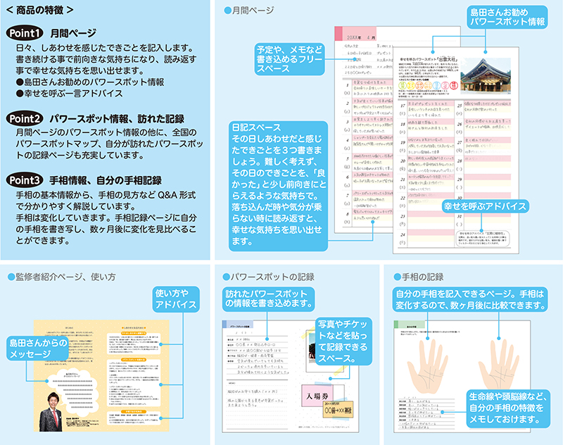 各月毎に、島田さんオススメのパワースポットの紹介と、「幸せを呼ぶアドバイス」を掲載していますので、運気を上げるための習慣作りや外出のきっかけなどに活用できます。
