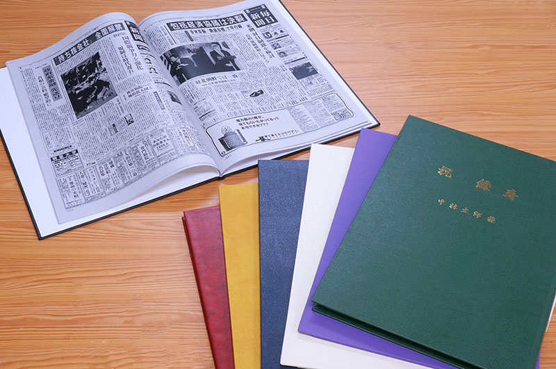 「想い出新聞製本」サービスは、生年月日からお祝い年数分の新聞記事(1面と最終面の両面印刷)を1冊の高級製本として仕立てることができます。