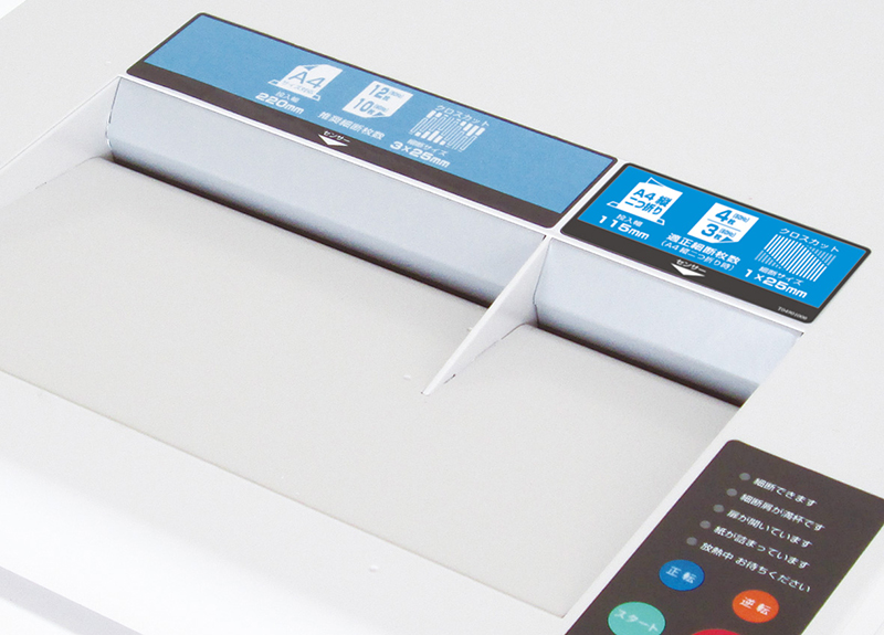 - 約3×25mm細断のA4対応投入口と約1×25mm細断のA6対応投入口を搭載。 処理量や書類の機密レベルに応じて細断寸法を選択できます