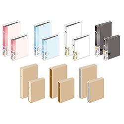 汚れに強く手軽に使えるPP表紙4種(ピンク・ブルー・ホワイト・ブラック)と、インテリアに馴染むナチュラルな風合いの布表紙3種(ベージュ・ブラウン・グレー)、全4種計14品番の豊富なラインアップですので、様々なライフスタイルに合わせてお選びいただけます。