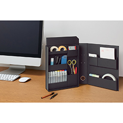 主人公が勤めるオフィスのデスク上に、筆記用具やメモを整理するための収納アイテムとして使用されています。