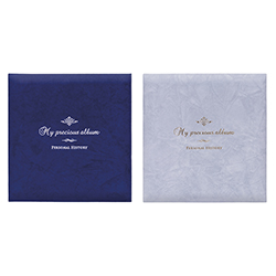 - アルバム表紙はスエード生地に箔押し加工を施した高級感のあるデザイン。紺(銀箔)とグレー(金箔)の2種。