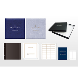 | 仕様 | 本体寸法:タテ335×ヨコ325×幅40mm 函寸法:タテ345×ヨコ345×幅50mm 本体重量(函込み) : 2,500g 表紙:スエード生地 台紙:Lサイズ 100年台紙(ブラック)10枚 (貼付有効サイズ:タテ315×ヨコ270mm) 前付け(思い出ノート)16頁付 コメントカード付 ガイドブック付 写真用封筒1枚付 化粧函入 |