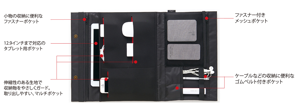 - 12.9インチまでのタブレット端末とケーブルなどのモバイルアクセサリーの収納に最適です