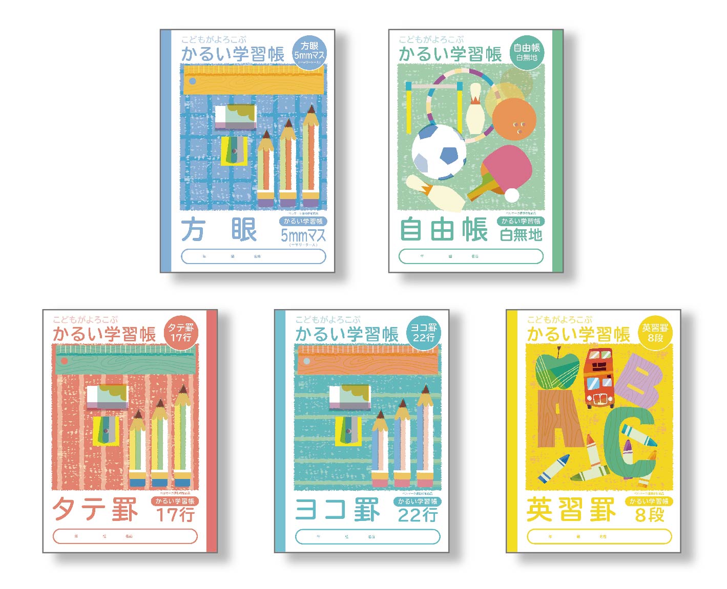 『こどもがよろこぶ』シリーズの「かるい学習帳」に方眼罫や英習罫などの全5種計15品番を追加しました。