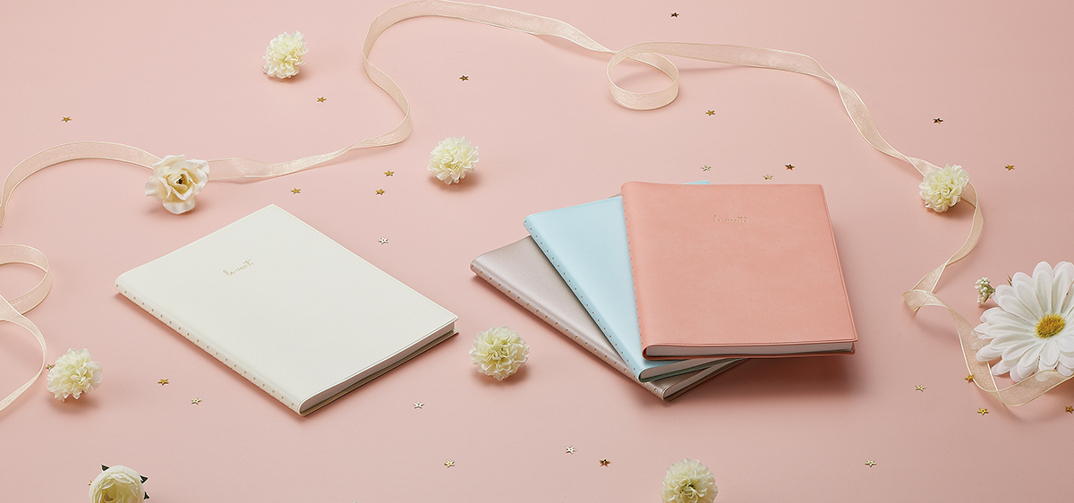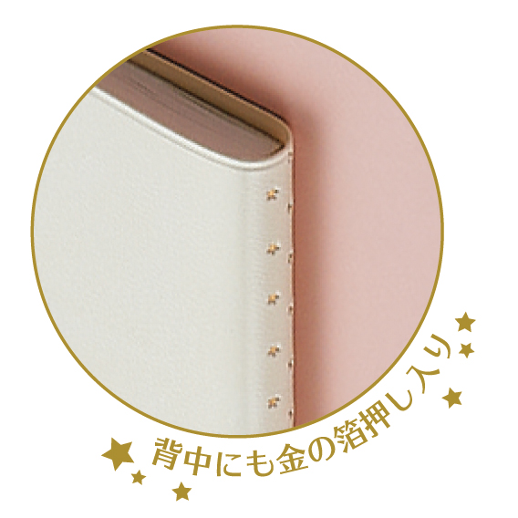 カラーラインアップは柔らかな色合いの全4色展開(ピンク、ブルー、アイボリー、ゴールド)です。皮革のような質感の表紙カバーを採用し、背表紙と表紙に金の箔押しを施した上品なデザインでビジネスシーンでも使えます。