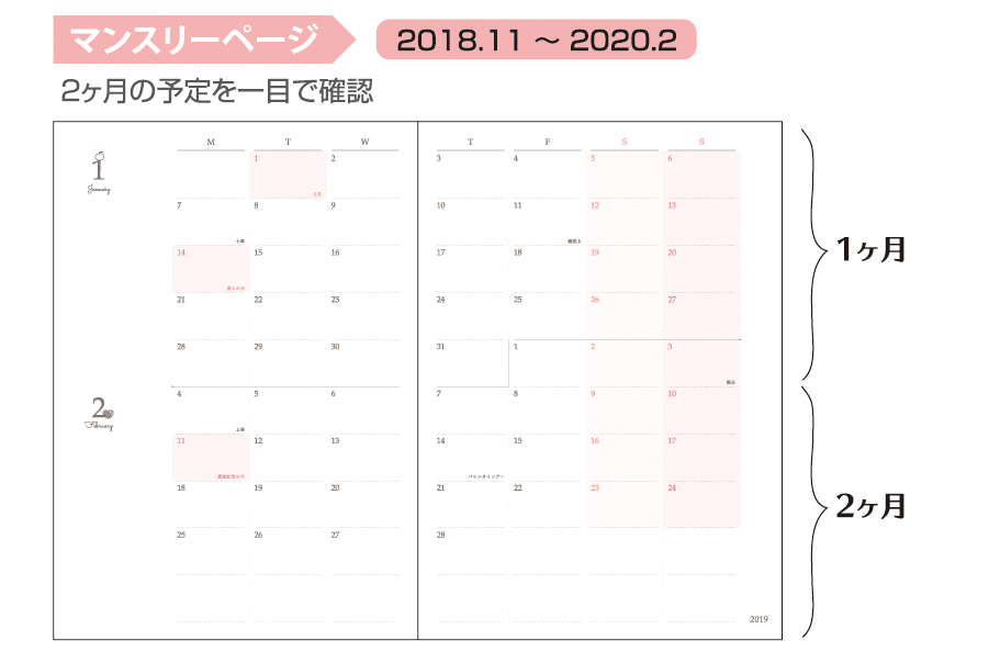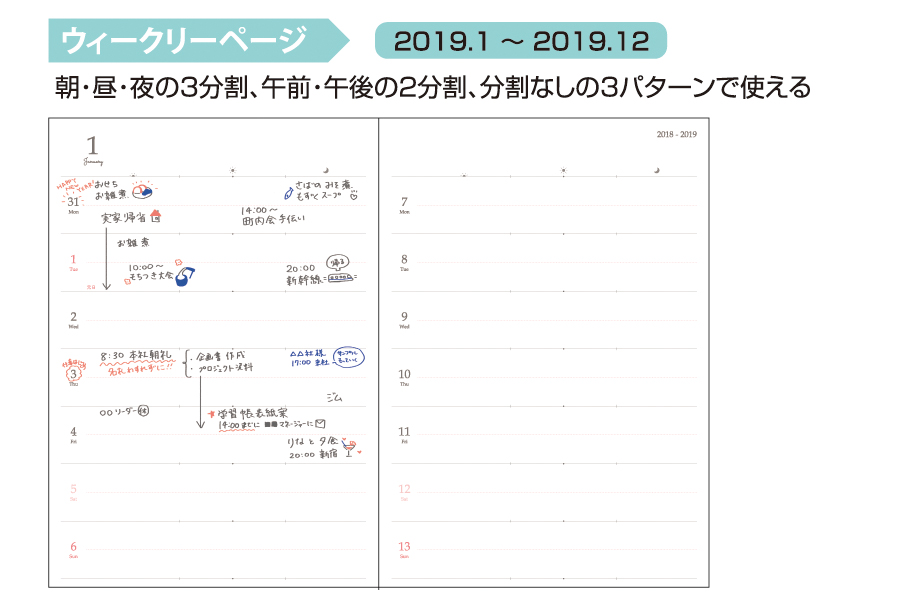 | 収録内容 | カレンダーページ (2018年9月~2020年4月) イヤープラン (2019年1月~2019年12月) マンスリーページ (ブロック式・見開き2か月・2018年11月~2020年2月) ウィークリーページ (レフト式・見開き2週間・2019年1月~2019年12月) ガントチャートページ (見開き2か月) メモページ (5mmドット罫)、ID・パスワードリスト、パーソナルデータ、切り取りメモ |