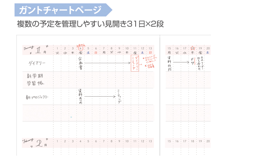 - 「マンスリー」「ガントチャート」は見開きで2ヶ月分、「ウィークリー」は見開き2週間分で、予定を俯瞰して確認できる