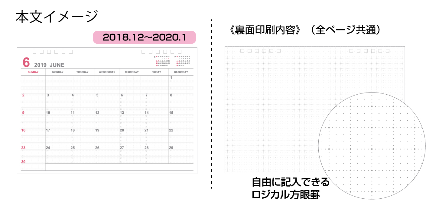 | 収録内容 | 年間カレンダー (1ページ・2019年1月~2020年12月) イヤープラン (1ページ・2019年1月~2019年12月) 月間カレンダー (14ページ・2018年12月~2020年1月) ノートページ (全ページ裏面共通・ロジカル方眼罫) |