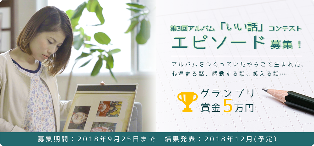 アルバムをつくる・見る・プレゼントする、受け取るなどの出来事から生まれた“いい話”を募集し、応募作品の中からグランプリを選出し、賞金を贈呈します。本コンテストを通じてアルバムの存在価値や良さを改めて感じるきっかけにして頂くことを、目的としています。