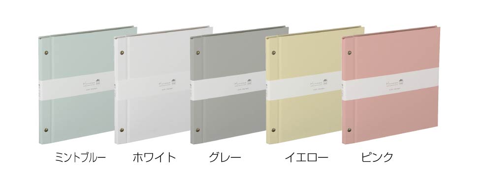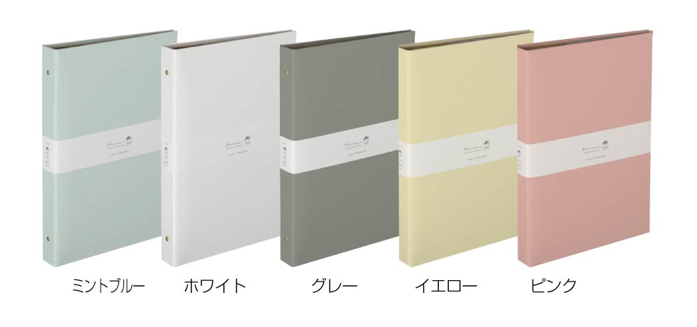 表紙のカラー展開はミントブルー、ホワイト、グレー、イエロー、ピンクの5色で、台紙はナチュラルなクラフト色です。