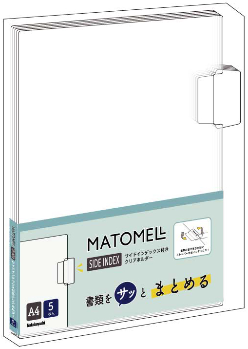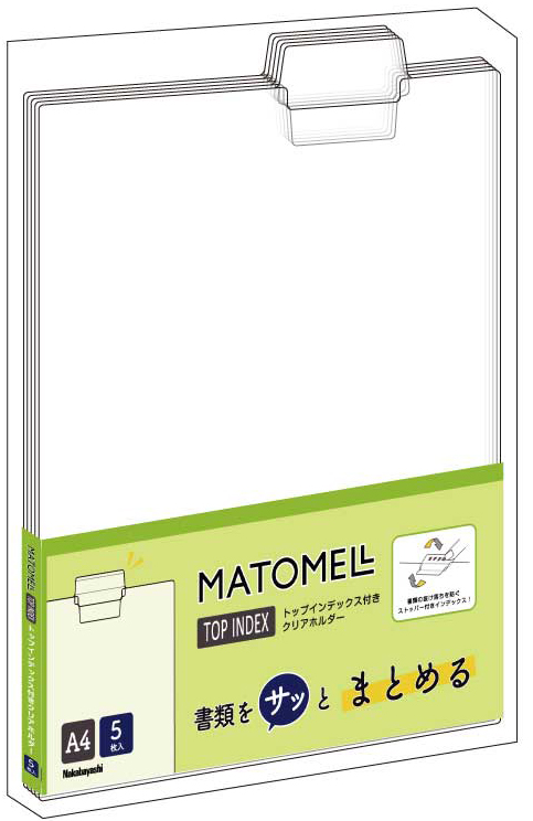 「MATOMELホルダー」は、外ホルダーと専用インデックス付きのクリアホルダーがセットになった収納アイテムです。デスク周りなど、バラバラに置かれがちなクリアホルダーを一箇所に収納することで、スッキリと整理でき、業務効率化に役立ちます。