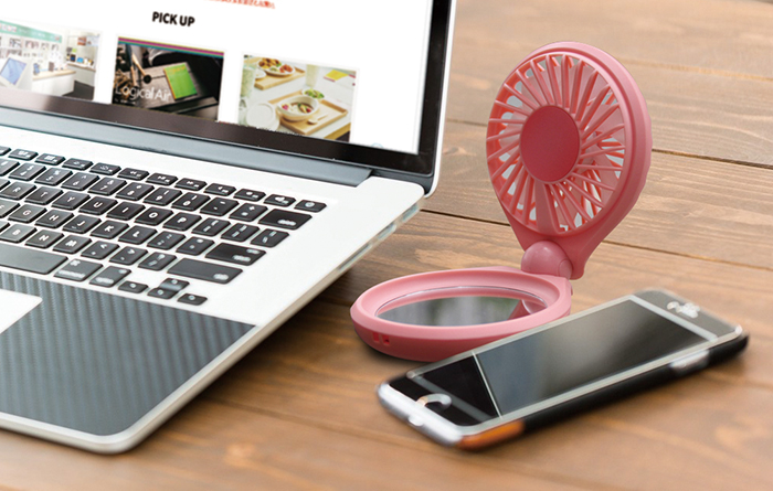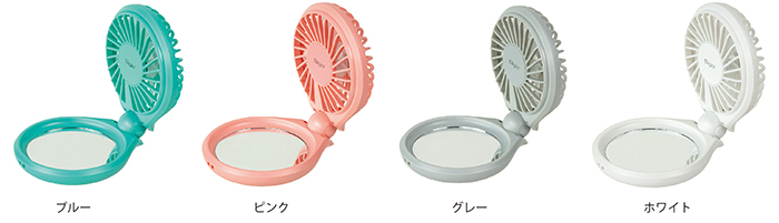 ラインアップは、持ち歩き、卓上のどちらでも使いやすい「卓上スタンド付きタイプ」、7枚ブレードでパワフル送風の「折りたたみタイプ」、シリコーンストラップ付きで持ち歩きに便利な「ストラップ付きタイプ」、鏡付きで身だしなみのチェックもできる「ミラー付きコンパクトタイプ」の4種類。