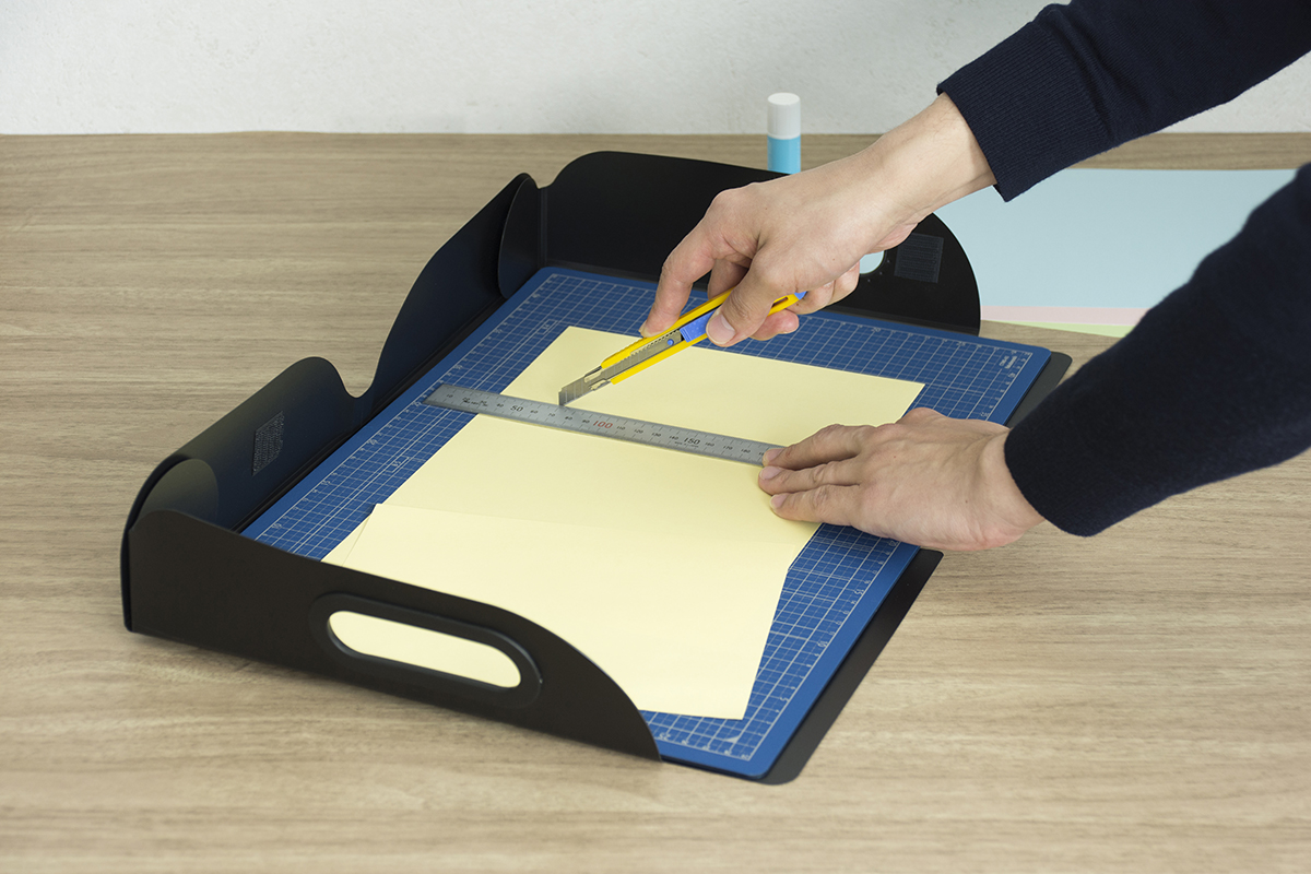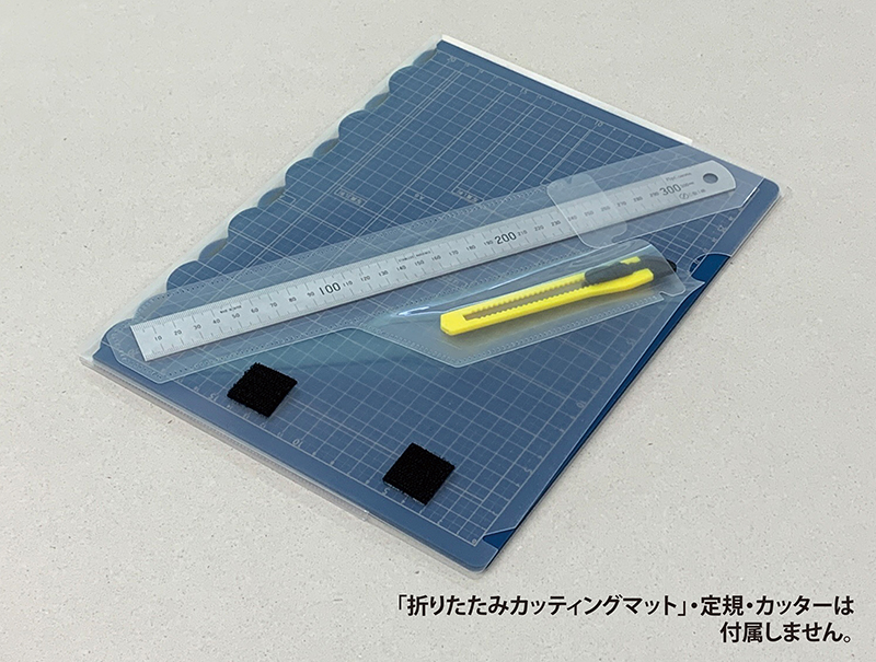 「折りたたみカッティングマット」と定規・カッターを収納する透明ホルダー付きです。(※3)