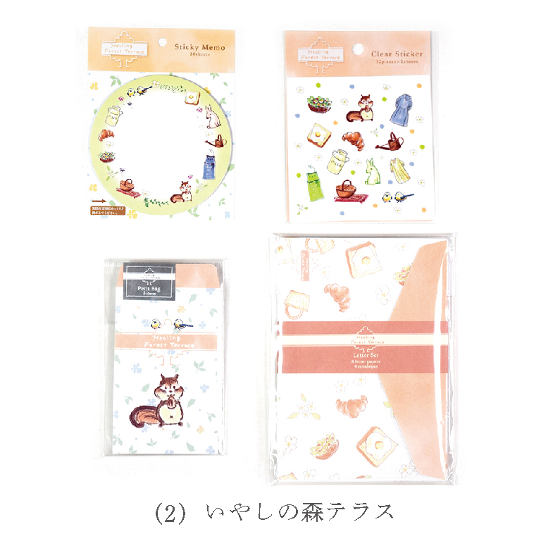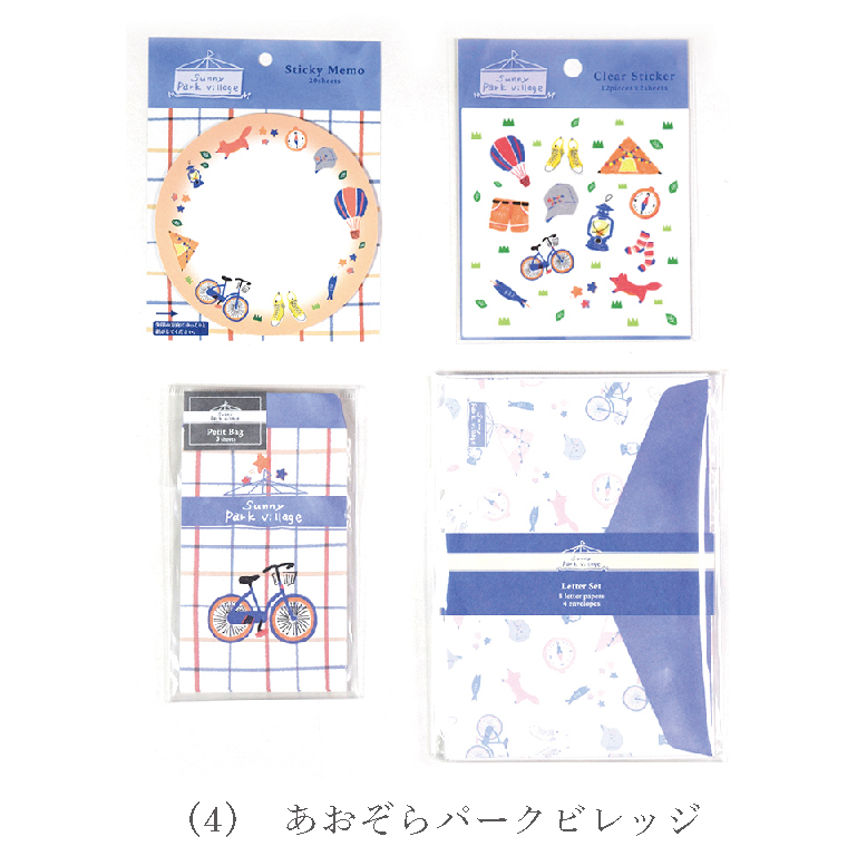 水彩タッチとパステルカラーを基調としたかわいいデザイン。 4デザイン(三日月ロマンチックリゾート、いやしの森テラス、なないろカフェストリート、あおぞらパークビレッジ)×ステーショナリー4種(ダイカットふせん、レターセット、ポチ袋、クリアステッカ―)の全16品番です。
