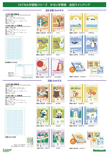 ナカバヤシ株式会社は、小学生向け科目別学習帳『ロジカル学習帳』シリーズの「かるい学習帳」に自主学習や方眼など全10種計12品番を新たに追加し、2021年7月上旬より発売します。
