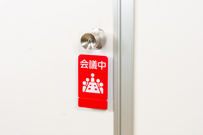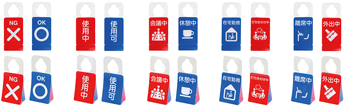 ラインアップは「NG・OK」、「使用中・使用可」、「会議中・休憩中」、「在宅勤務・打ち合わせ中」、「離席中・外出中」の5種類。裏表の異なる表示内容に、付箋を貼って情報を補足するなど、様々な状況で活用できます。