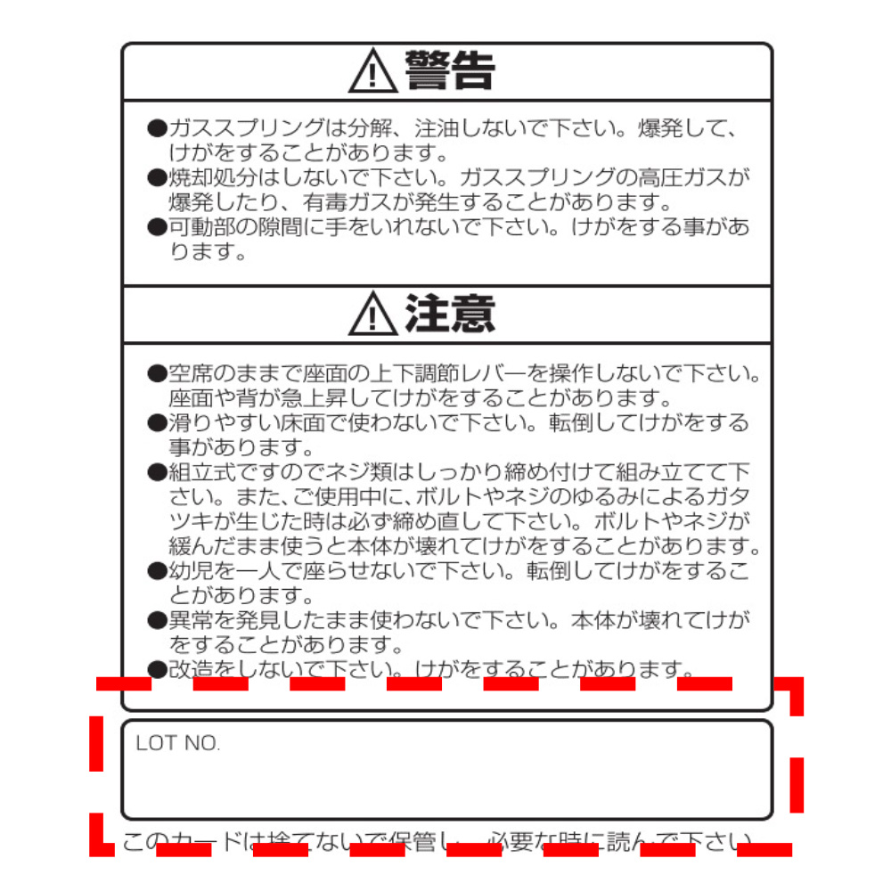 万一、ご使用中に当該脚部が破損いたしますと、転倒事故等につながるおそれがございますので、大変恐縮ではございますが、下記の対象ロット番号の商品をご使用中又はお持ちのお客様におかれましては、専用受付フォームにてご連絡をいただきますようお願い申し上げます。弊社より脚部の強度を改善した商品(組立完成品)をお送りさせていただき、お手元の商品と交換させていただきたく存じます。