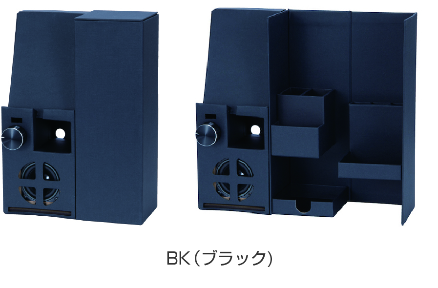 - シンプルな形状をした卓上収納にスピーカー機能を搭載した紙箱型収納用品です。