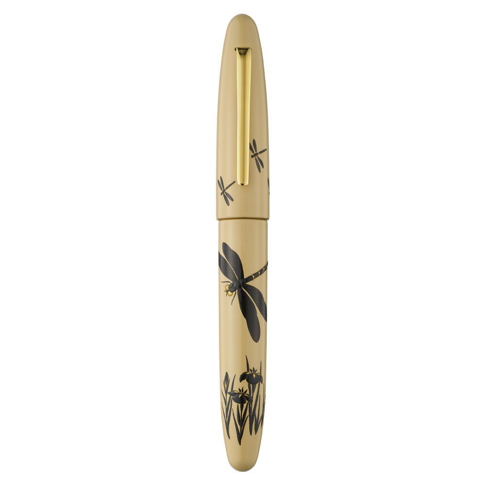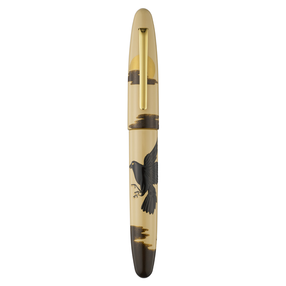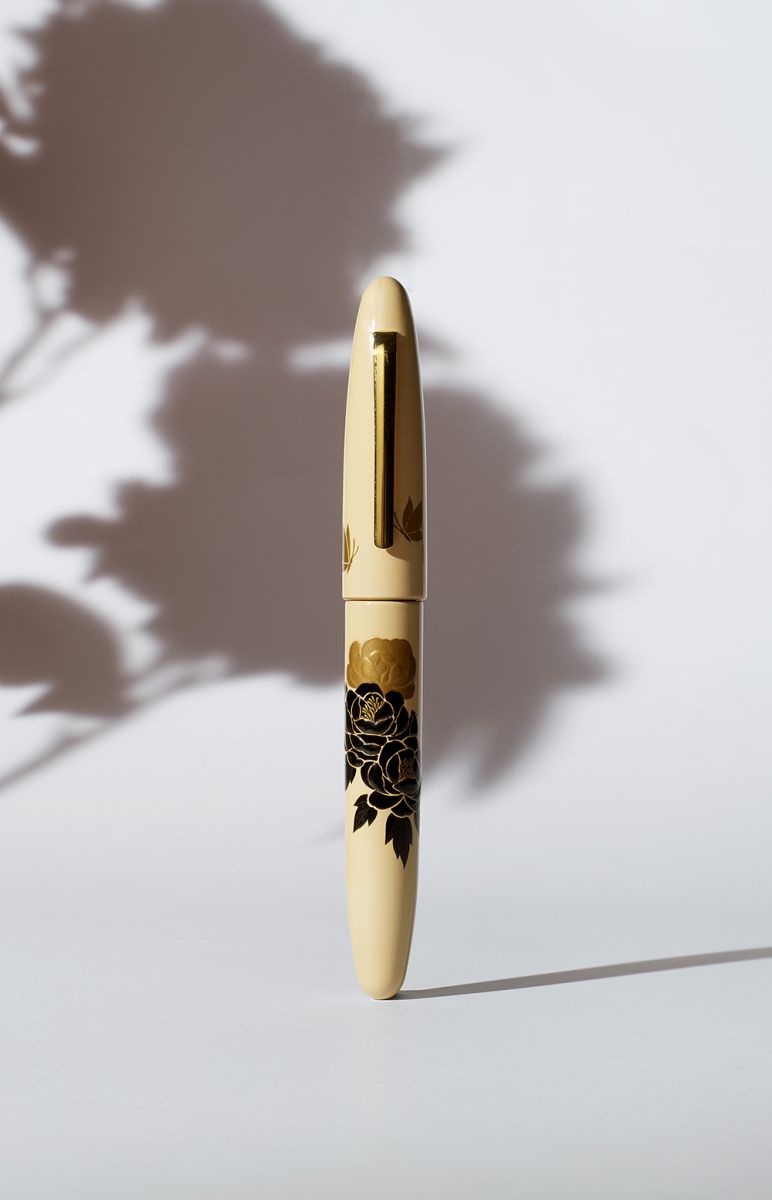 白漆ベースに蒔絵で和を感じる文様を表現した万年筆です。熟練した日本の塗職人によって製作された漆色の深みと蒔絵の繊細さが際立つ上質感のある万年筆です。図案は全3種類。吉祥文様である華やかな組み合わせの「牡丹と蝶々」、まっすぐ前にしか飛ばないことから「不退転」の精神を表す「蜻蛉」と「菖蒲」(勝負)を組み合わせた「蜻蛉と菖蒲」、神話で登場する3本足の烏「八咫烏」と太陽をモチーフにした「八咫烏と太陽」です。