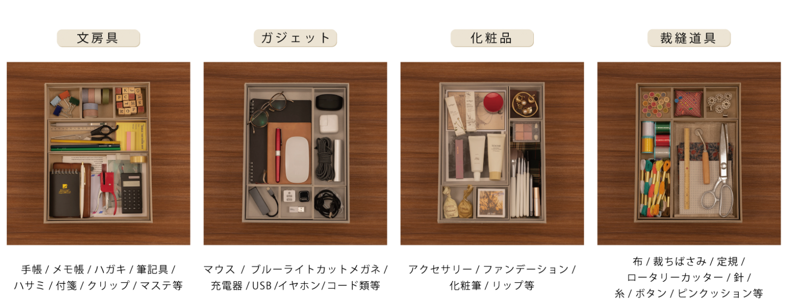 各トレイの高さは外寸37.5㎜/内寸35㎜。乱雑になりがちな引き出し※の中も、すっきりと整理できます。小分けトレイは一つ一つ取り出せ、卓上収納としても使用可能。仕事や趣味でよく使うものを収納することで、作業効率向上につながります。
