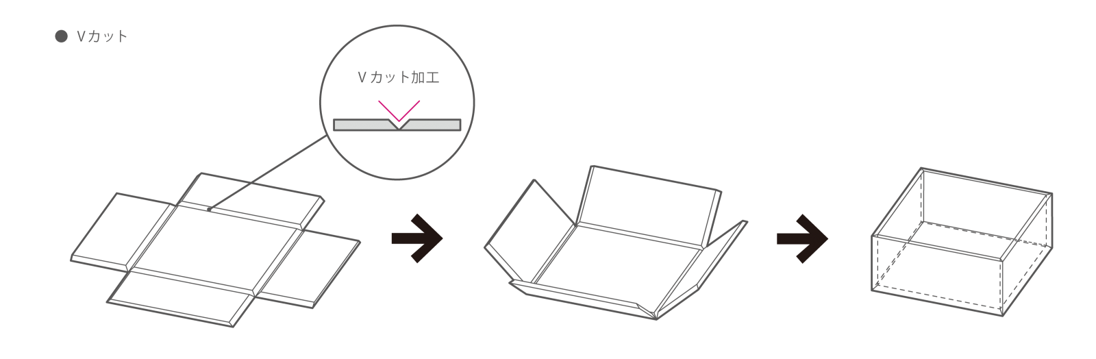 一般的な整理箱(貼り箱)は芯材を貼紙で包んで製造するのに対し、本製品は折り・接合部分に「Vカット加工」を施すことで最小限の材料で組み立てて製函しています。