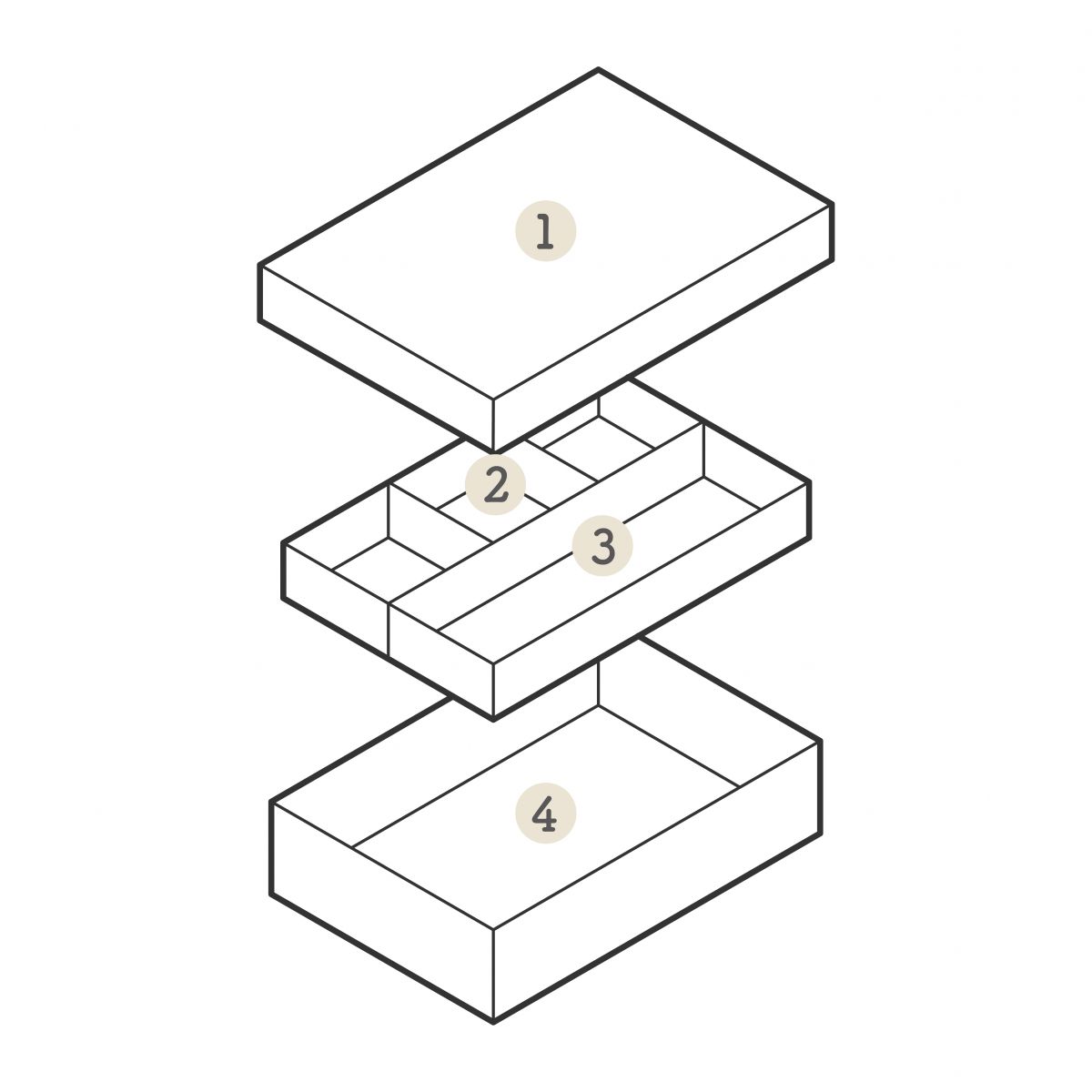 | 製品仕様 | 本体寸法:約W264×D182×H65mm ①整理箱蓋 外寸:約W264×D182×H37. 5mm / 内寸:約W259×D177×H35mm ②小分けトレイS×3個 外寸:約W82×D82×H37. 5mm / 内寸:約W77×D77×H35mm ③小分けトレイM×1個 外寸:約W246×D82×H37. 5mm / 内寸:約W241×D77×H35mm ④整理箱底 外寸:約W255×D173×H62. 5mm / 内寸:約W250×D168×H60mm 本体重量:約453g ![]() |