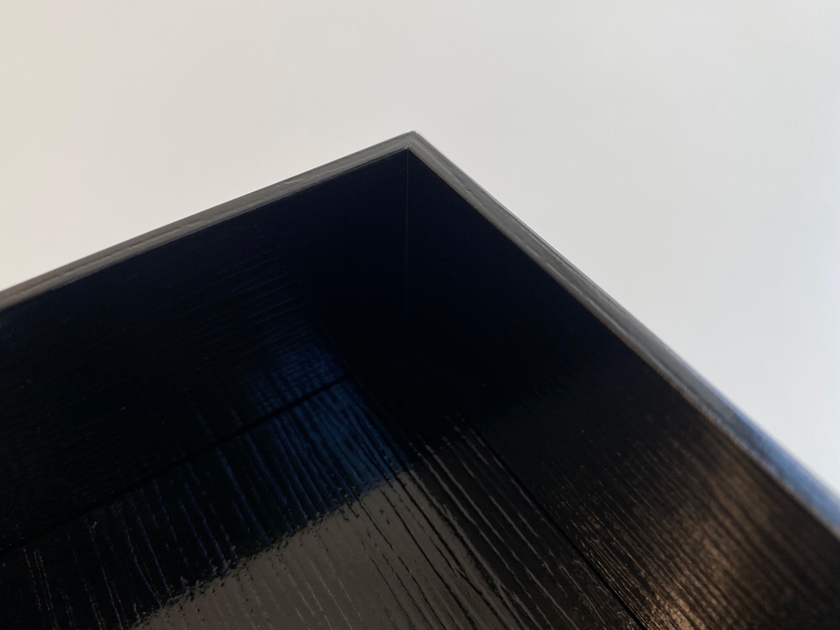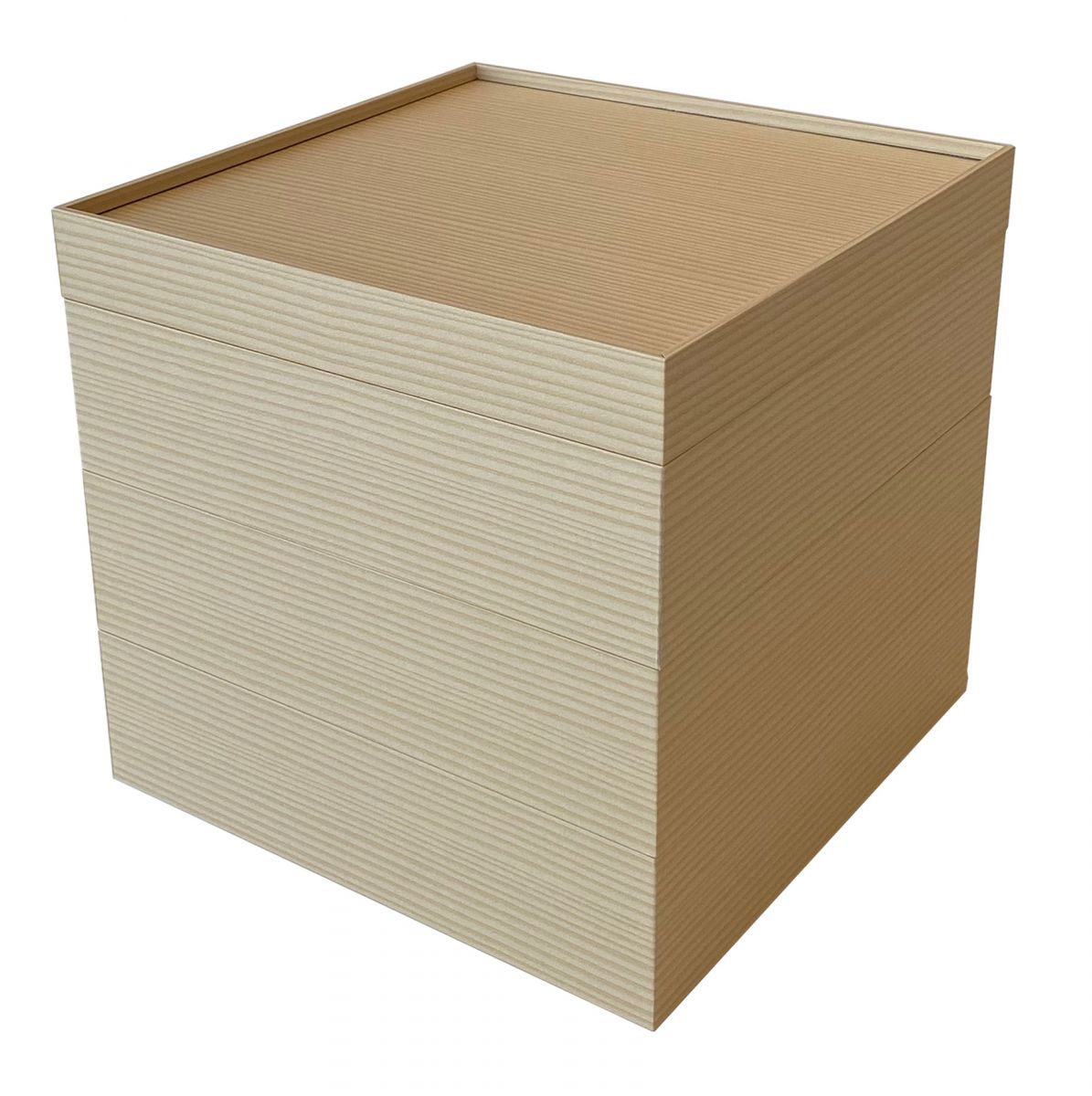 紙製重箱の製造は、「フエルアルバム」の写真台紙で培った合紙技術を用いて、重箱本体の紙とフィルムの合紙から、本体の組立てを一貫して行うことにより、短納期が可能です。また、当社ステーショナリー製品で使用されている印刷・Vカット技術を活用することで、高い印刷精度と、綺麗な角の仕上がりを実現しています。
