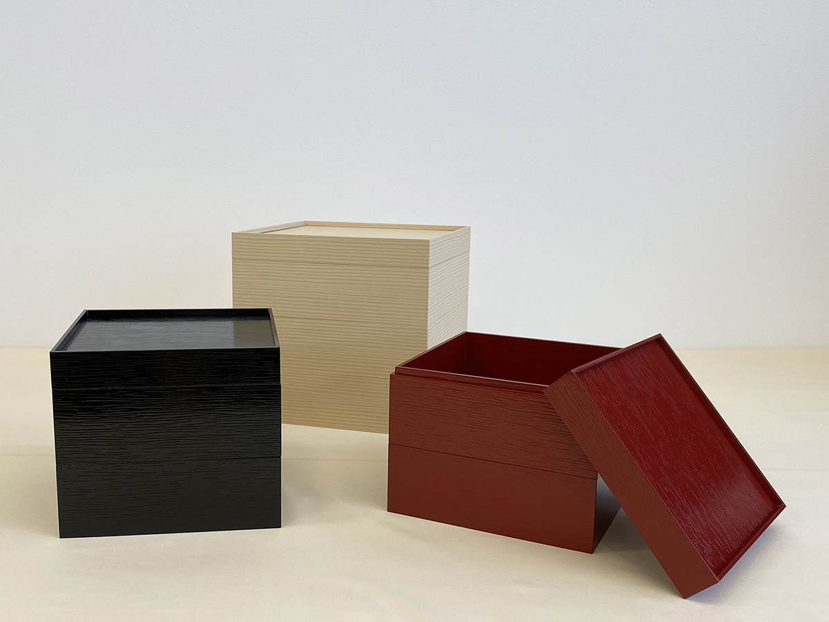 サイズは5寸(140×140×45mm<内寸>)と6.5寸(184×184×39mm<内寸>)、各サイズ1・2・3段、3色(黒・赤・もみがら)展開。おひとり~ファミリー向けまで、ニーズに合わせたラインアップ展開です。