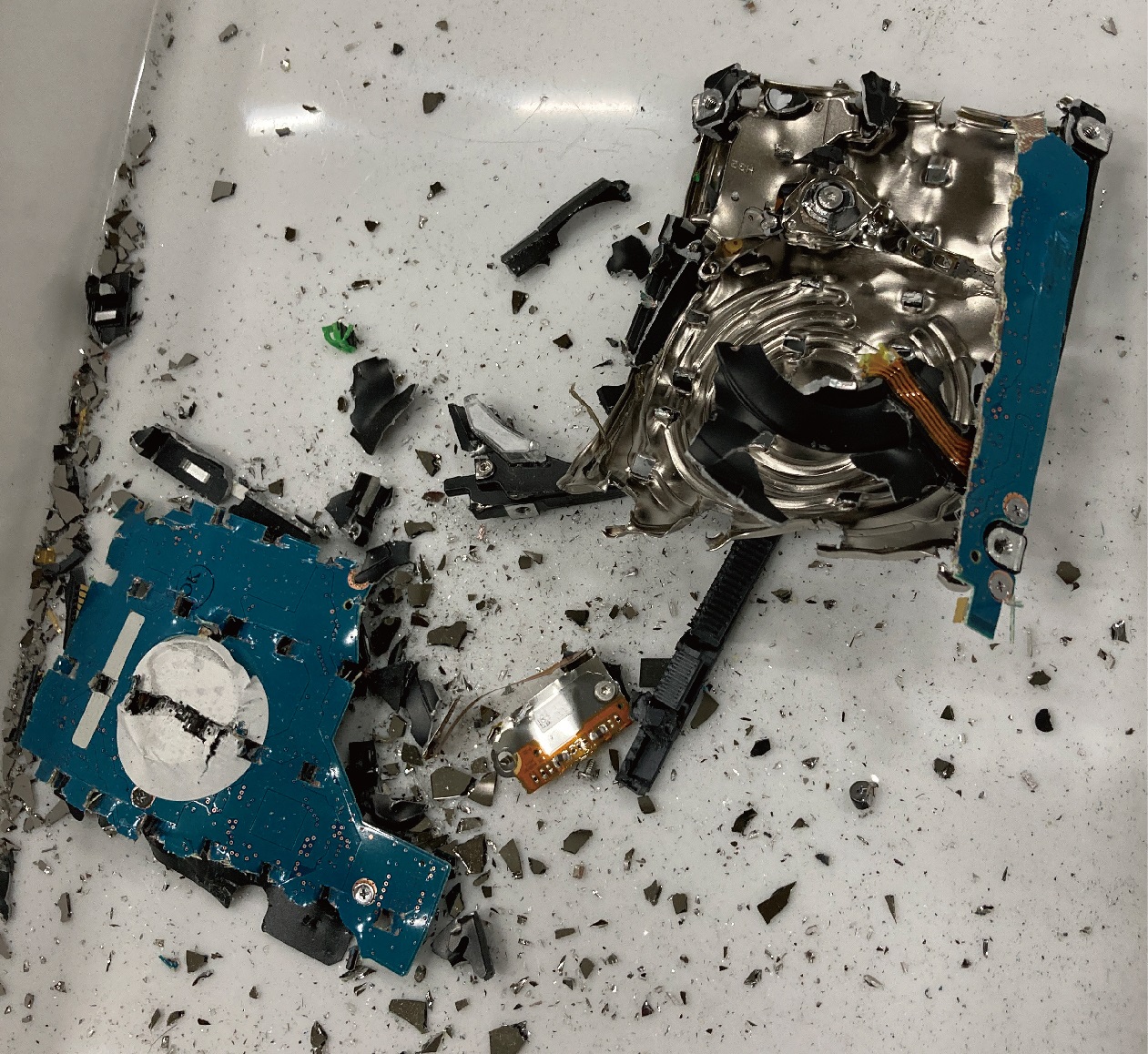 | 3.5インチHDD(V字曲げ破壊) | 2.5インチHDD(押しつぶし破壊) | 2.5インチSSD(押しつぶし破壊) |