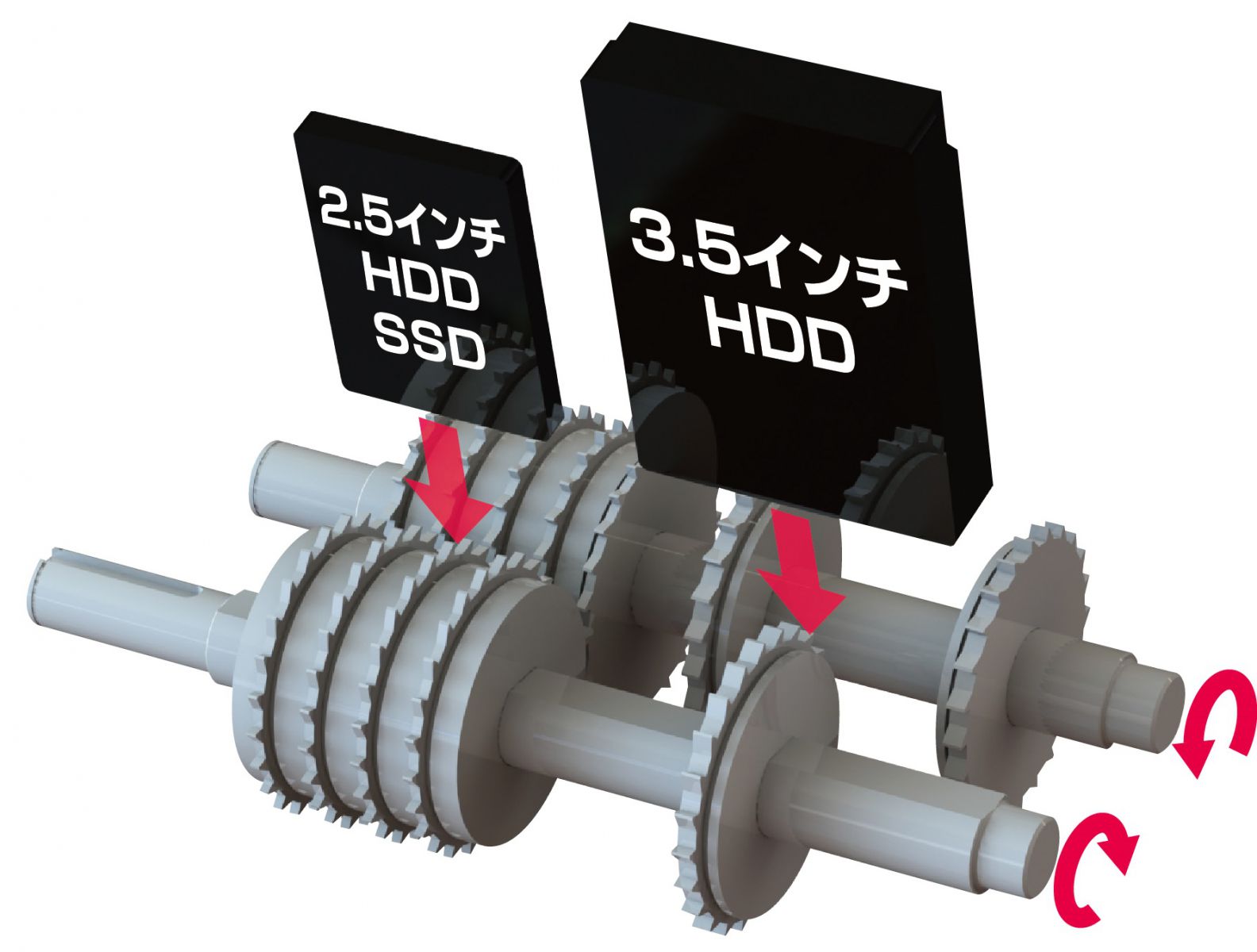 - 3.5インチHDDは「V字曲げ破壊」、2.5インチHDD/SSDは突起のある刃による「押しつぶし破壊」にて物理破壊