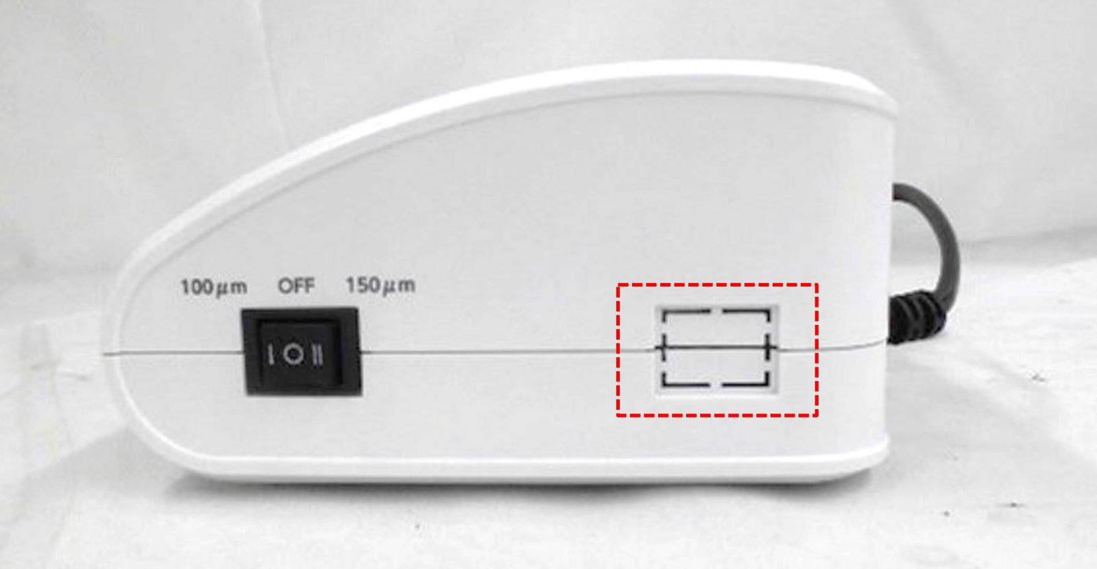 右図のように当該切り欠き部を強く押し込む行為をお止め下さい。万一切り欠き部が破損した場合に破損個所より指などを入れますと、機械内部の電源部分に触れて感電或いはケガをする恐れがございます。 |