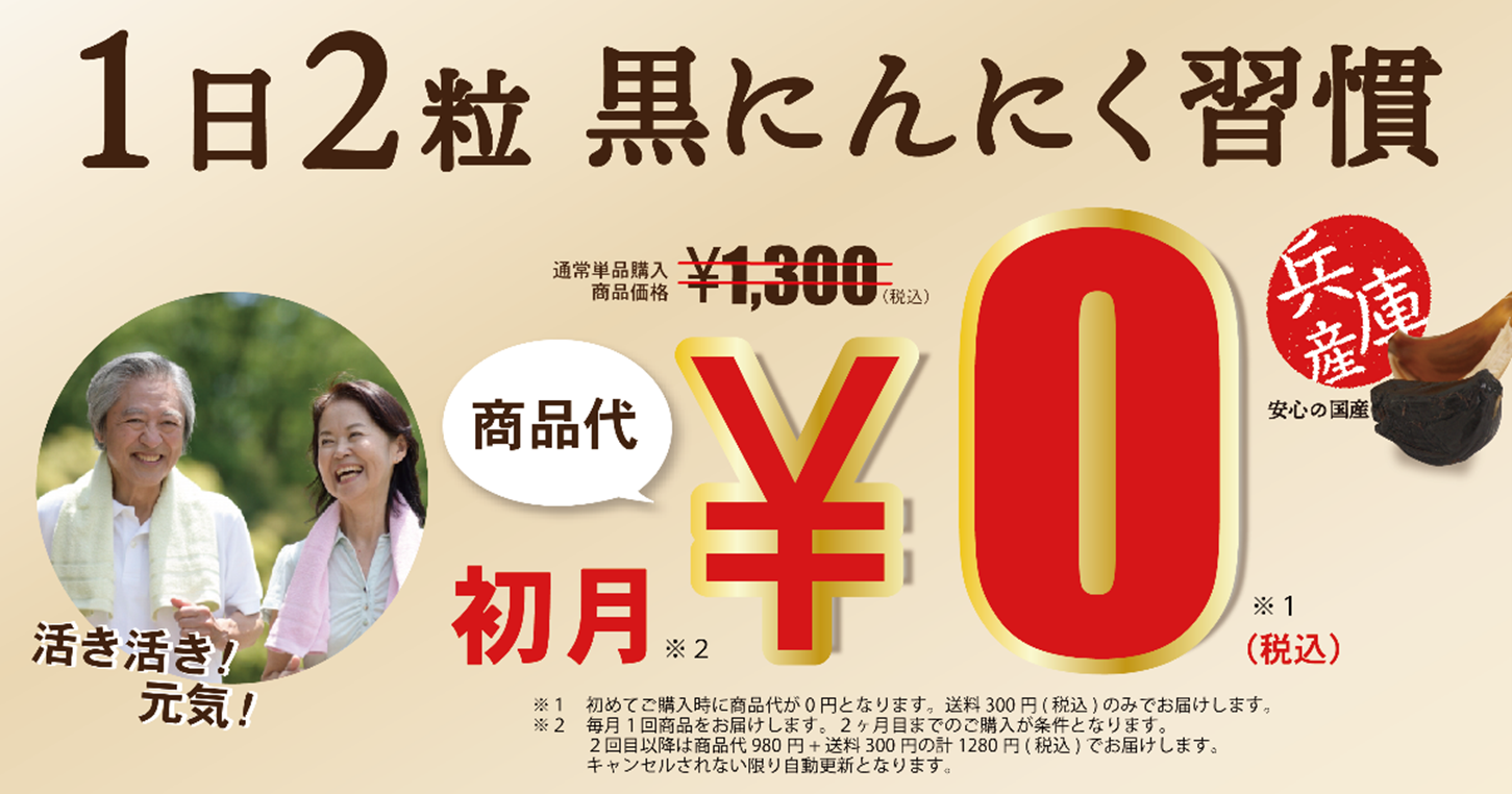 この度、多くの方に気軽に始めていただけるよう初月商品代0円でお届けします。2回目以降も通常商品25%OFFの980円(税込)とお得な価格のため、お手頃な価格で1日2粒の黒にんにく習慣を続けられます。