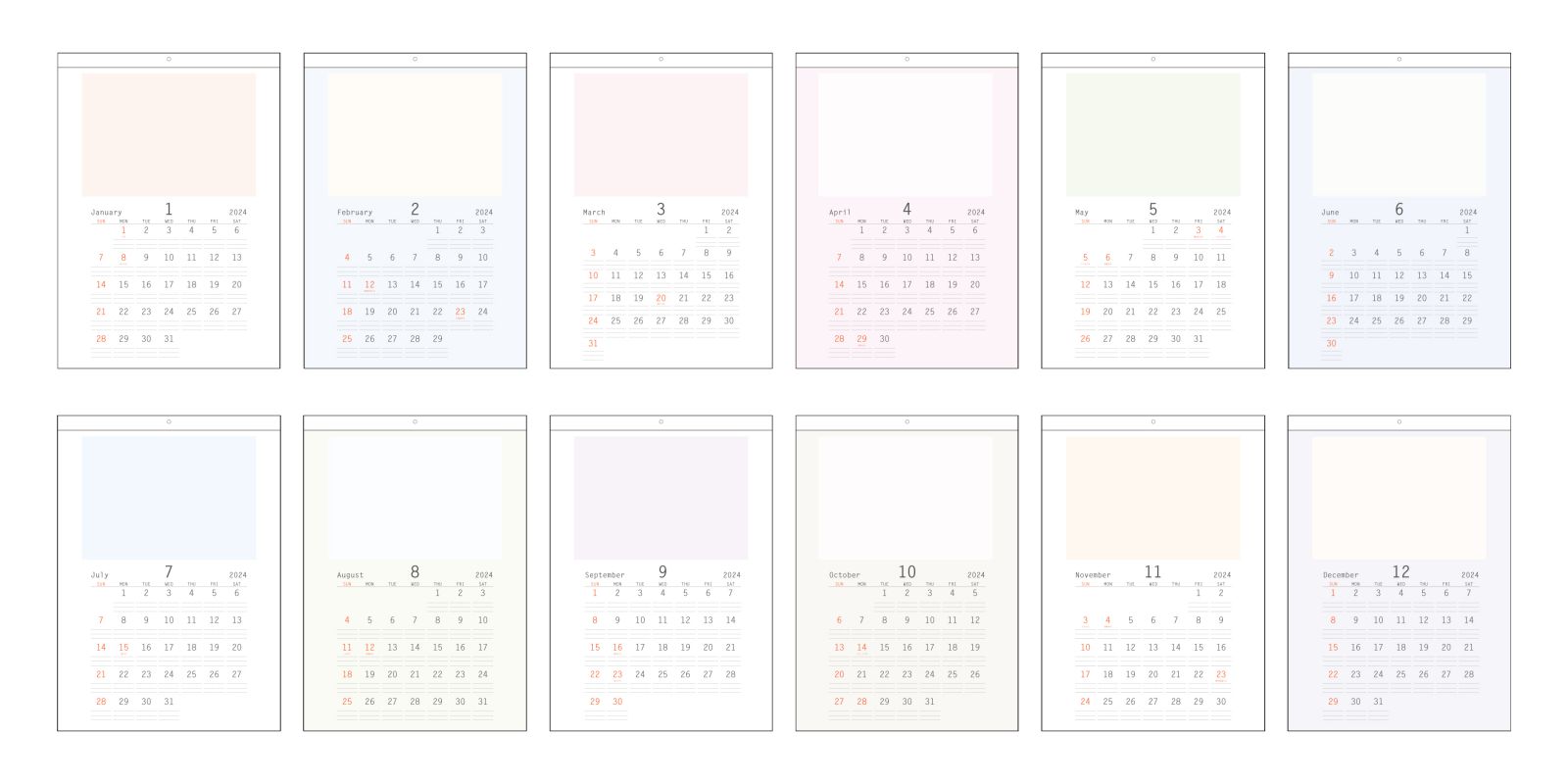 フリースペースと背景の配色が毎月異なるバイカラーデザインで、そのまま飾ってもインテリアのアクセントになる自由度の高いカレンダーです。