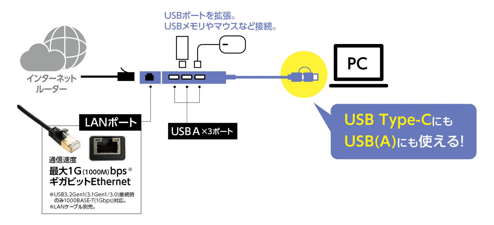 Type-CコネクタとType-Aコネクタを使い分けられるLANポート付きUSBハブ