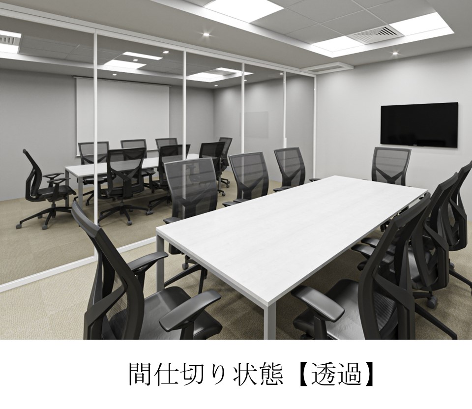 調光機能は、ON/OFFの操作による【透過】・【非透過】切り替えが出来るため、お部屋をパーティションで区切る「間仕切り状態」でも、【透過】状態にすることで開放感を演出できます。