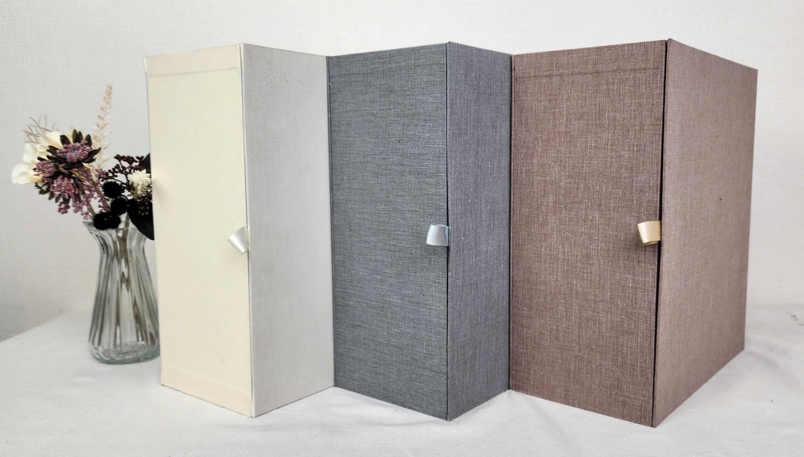カラーラインアップは落ち着いた色合いのアイボリー、グレー、ブラウンの3色です。表紙は上品な布クロス素材を採用し、お部屋のインテリアと調和します。