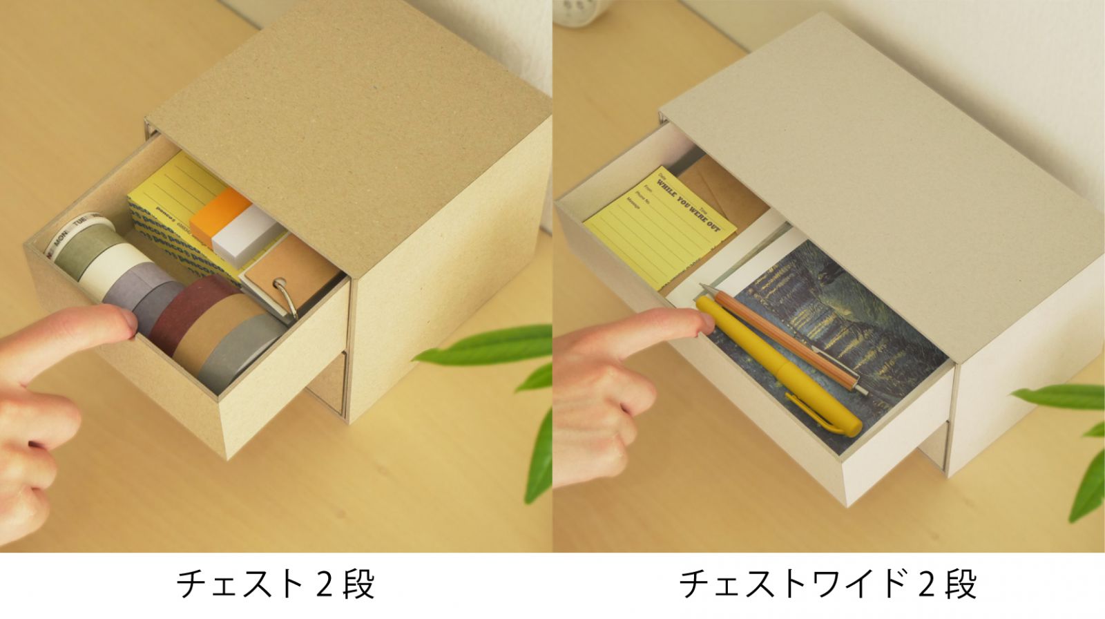「チェストワイド2段」は、郵便物やポストカードなど、一般的に流通している封筒(長形3号)がぴったり収まるように横幅が広くなっています。