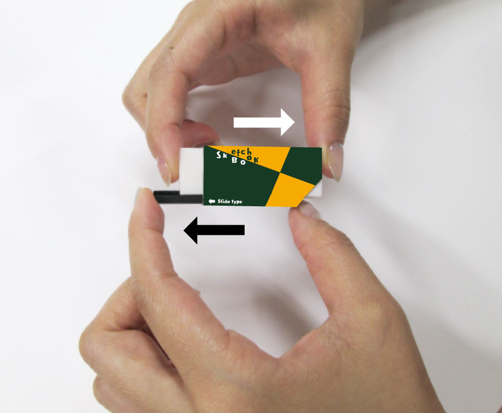 - 「スライド消しゴム・図案柄」は2種類の消しゴムをスライドさせて用途ごとに使い分けられる