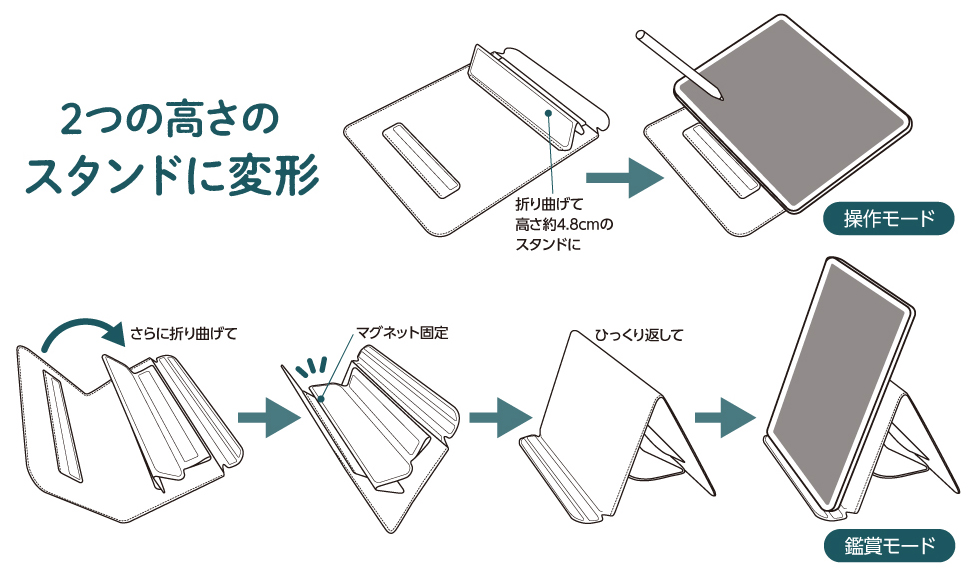 「iPad 11インチ用スタンドスリーブ」は折りたたんでスタンドに変形する11インチサイズのiPad用スリーブケースです。スリーブケースを折り曲げるだけの簡単操作で、緩やかな傾斜でタッチペンなどでの作業がしやすい「操作モード」と、角度をつけて鑑賞に適した「鑑賞モード」の2種類の高さに変形します。マグネットで固定し、スタンドになるため、安定した使い心地でご利用いただけます。