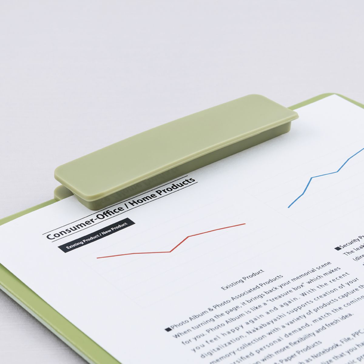 従来のクリップボードと異なり、クリップがタテ・ヨコに移動する「移動式クリップ綴具」を採用しているため、書類の向きを気にせず使用することができます。また、金属製クリップの上には、開け閉めがかんたんにできる樹脂製のワイドクリップカバーが付いています。今まで2種類のクリップボードを用意していた方や、仕方なく向きの違うクリップボードを使用していた方でも、シフテがあれば、この製品ひとつで常に効率の良い形状で作業することができます。