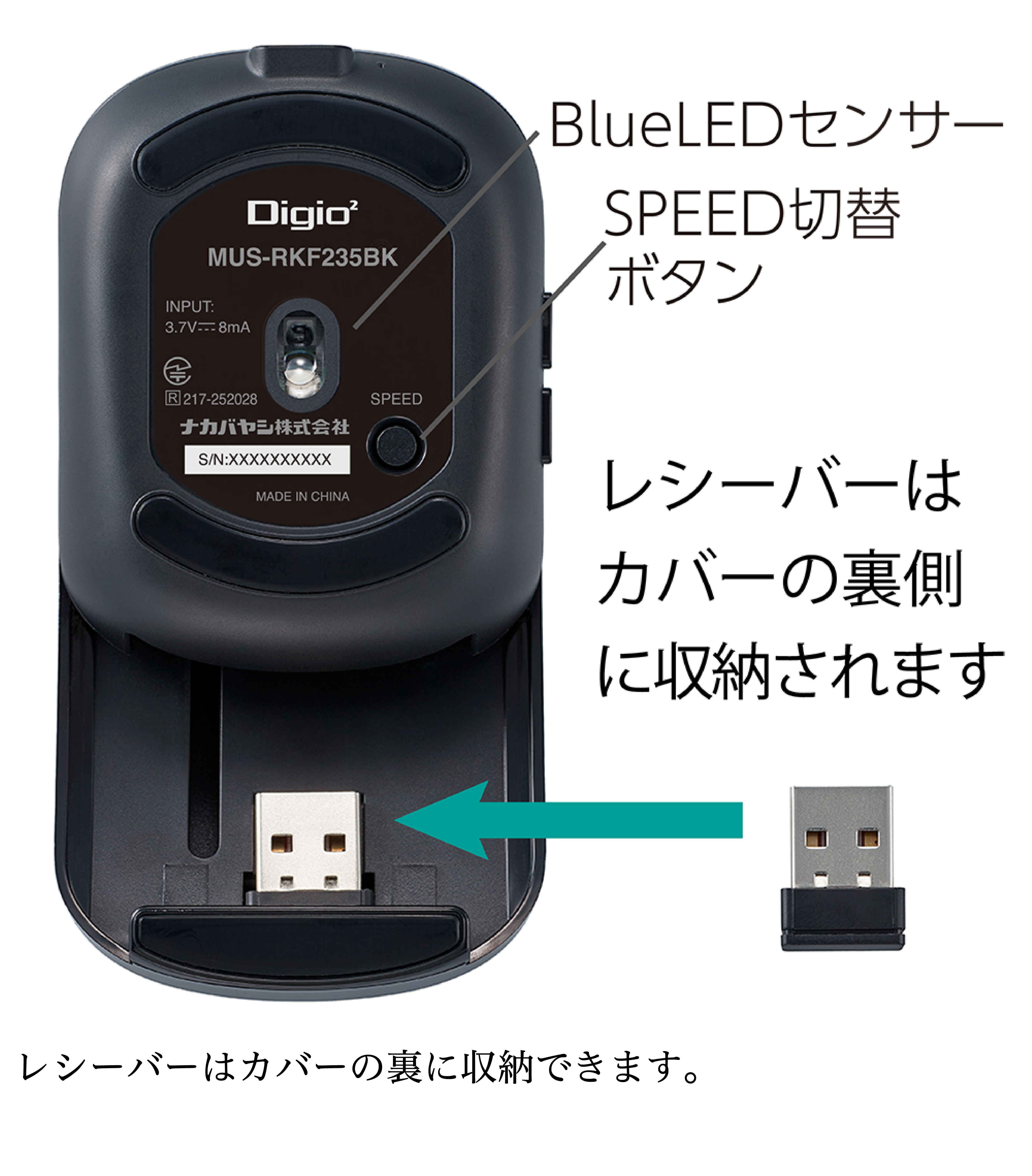 - PCに挿入するだけで使用できるレシーバー通信。レシーバーはカバーの裏に収納可能。