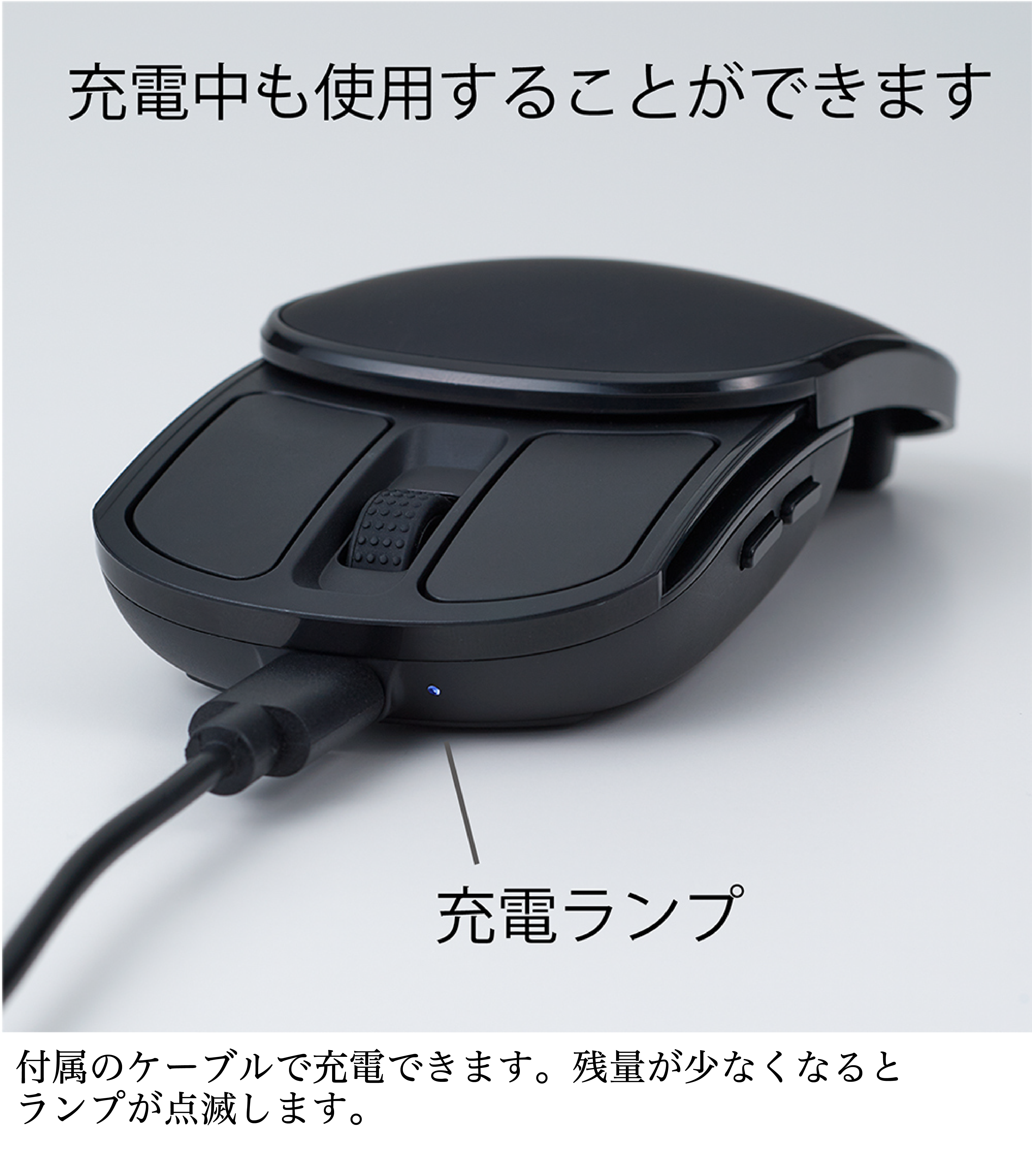 軽くコンパクトな充電仕様。USBケーブルで充電。外出先でも充電できます。シンプルなレシーバー通信無線。 ※ケーブルは通信しません。充電中の使用にもレシーバー接続は必要です。
